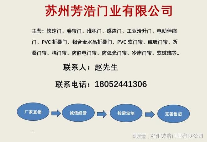 苏州芳浩门业有限公司以生产快速门,PVC磁吸门帘、折叠门帘、棉门帘、PVC折叠门、铝合金折叠门等产品